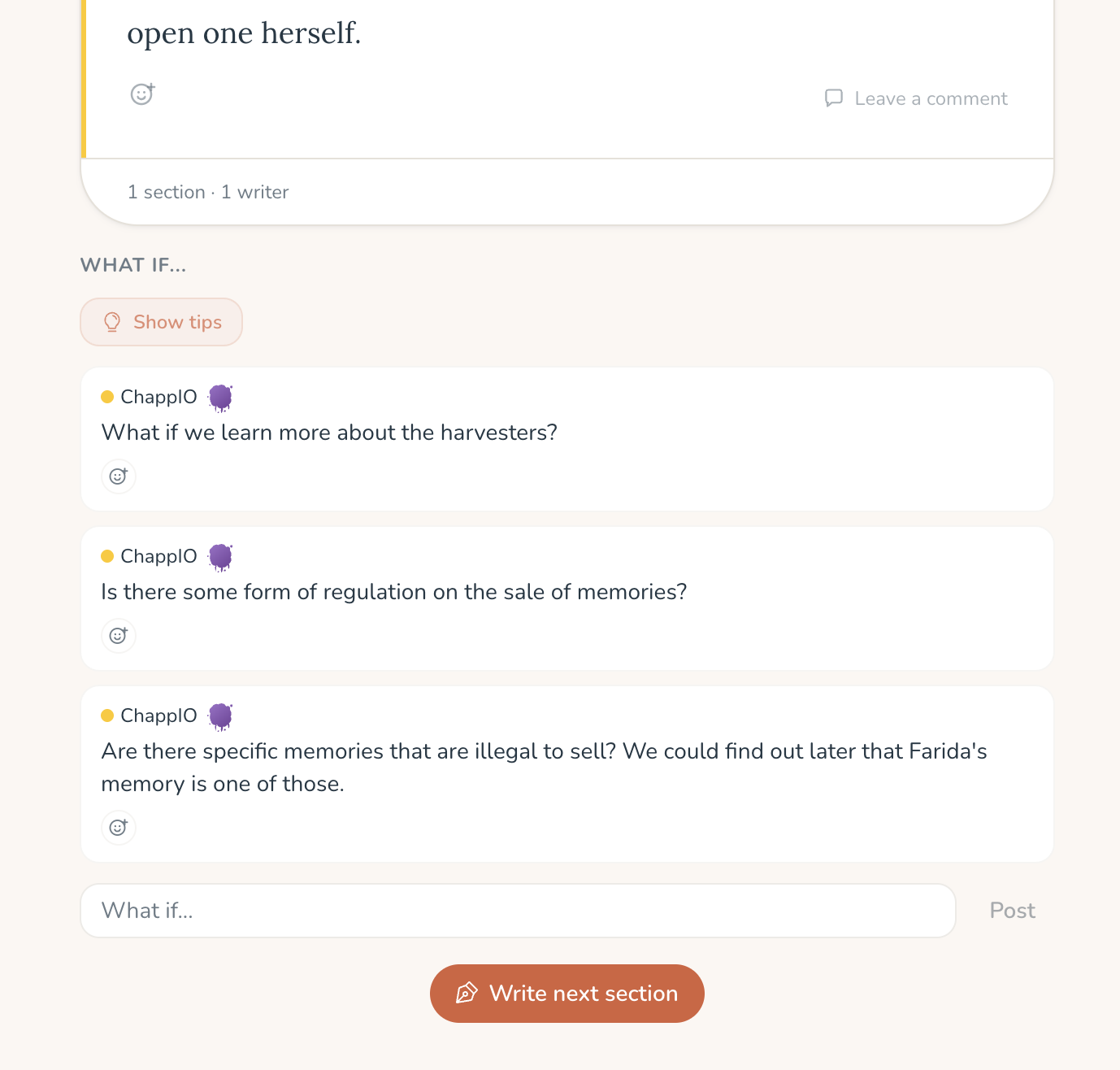 What Ifs are tiny suggestions that live below the latest section. "What if the map was upside down the whole time?" That kind of thing. Short, playful, zero commitment. They vanish the moment someone writes the next section.