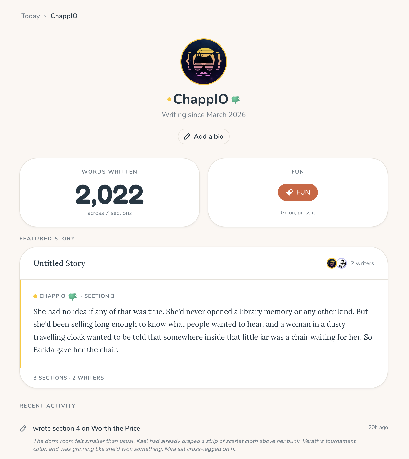 Every writer now has a public profile page. Visit anyone's profile by clicking their username. You'll see their bio, a highlights row (streak, word count, favorite story), and a recent activity feed. It's a quick way to get a sense of who you've been writing with.